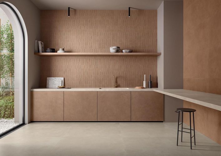 Les trois surfaces en relief, dans les couleurs Cotto et Bianco, reflètent sur les murs des trames volontairement irrégulières et un rythme de la matière évoquant la qualité artisanale des briques façonnées à la main.