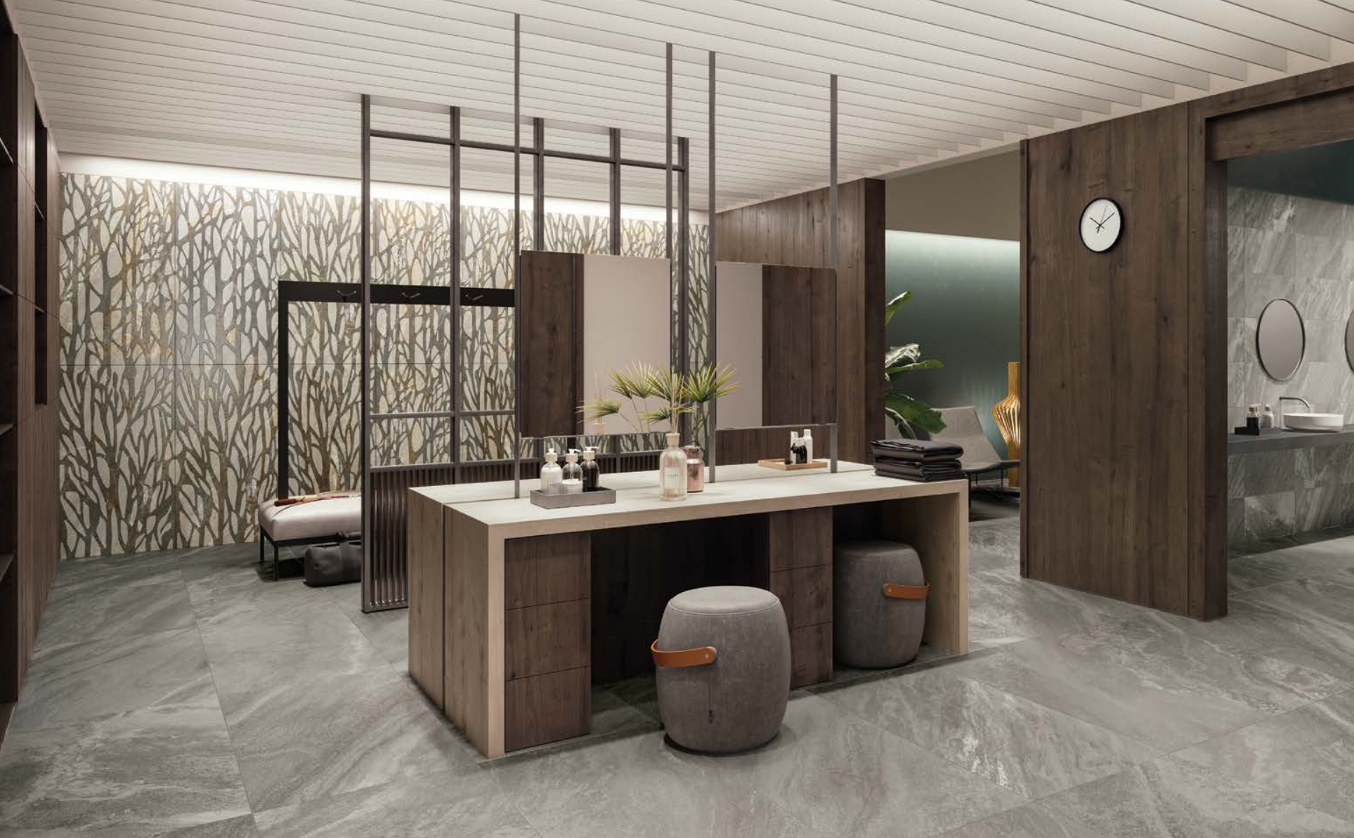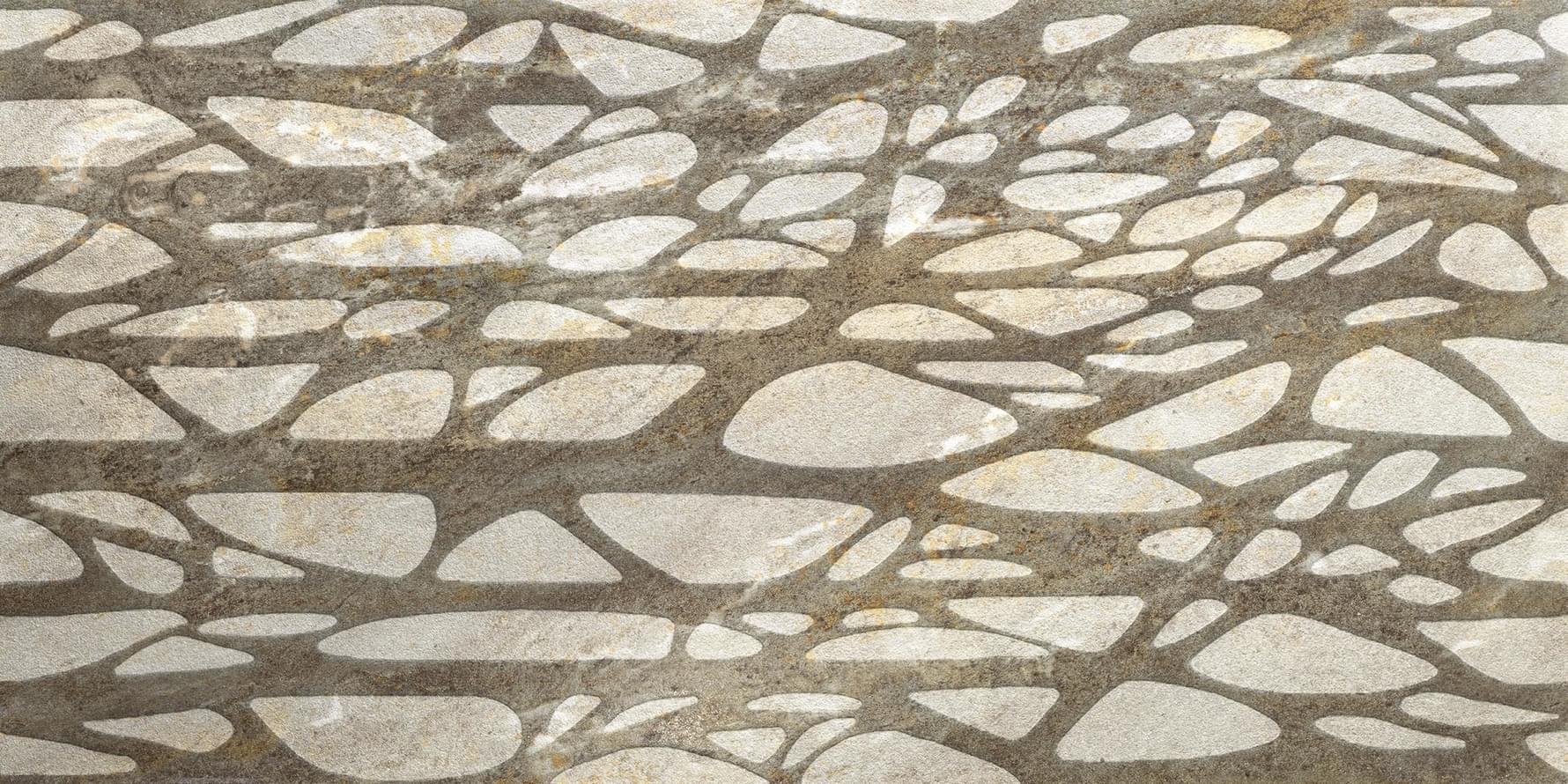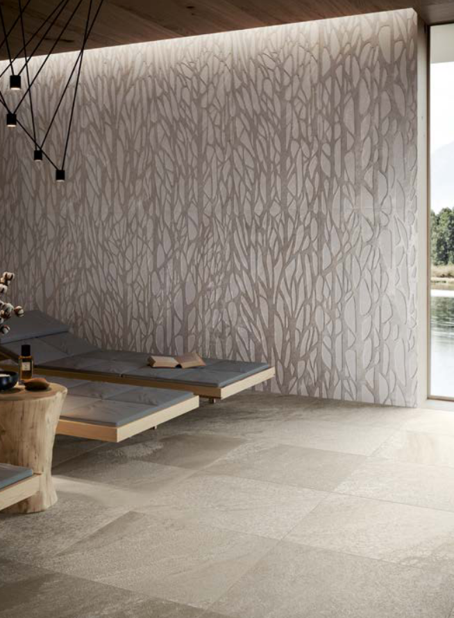 Le détail de la surface d’Evoluta présente des niveaux de tridimensionnalité et de variabilité d’épaisseur comparables à ceux de la pierre naturelle.