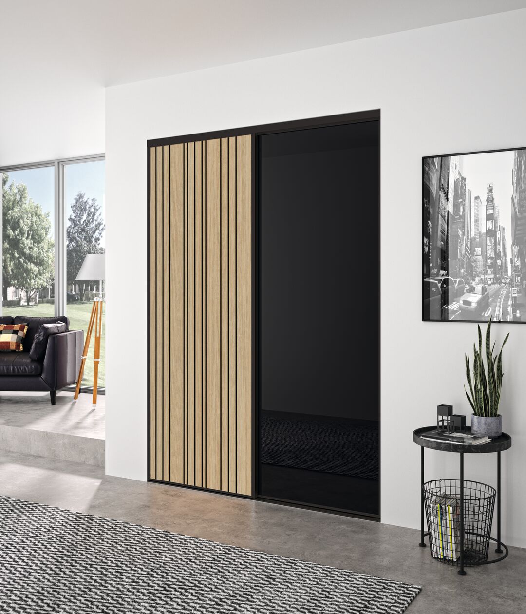 La gamme de placard Résidence offre une structure aluminium avec 4 amortisseurs par façade montés de série, et un remplissage d’une épaisseur de 16mm.