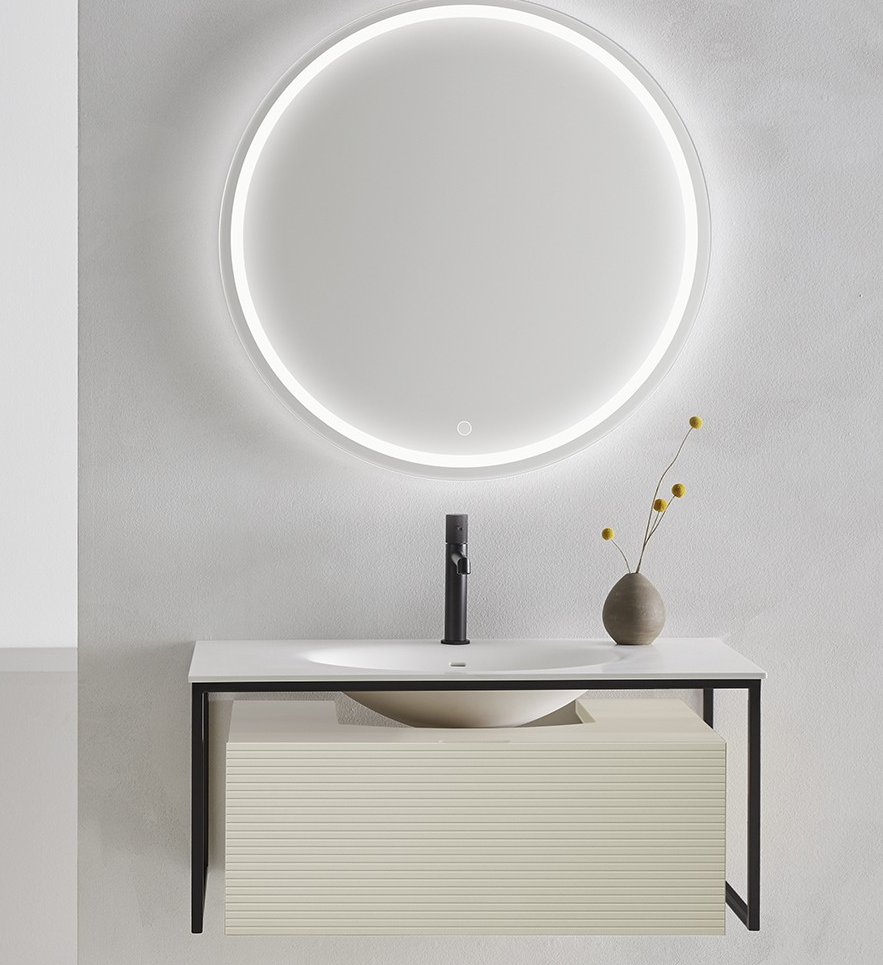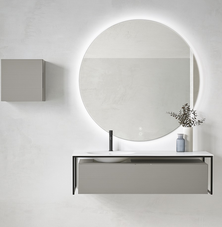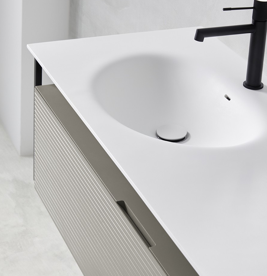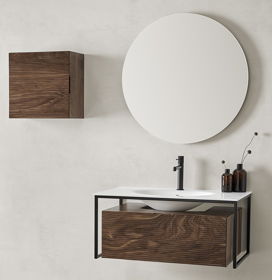 Un jeu de matières souligné par une structure en métal laqué noir. Chaque détail est soigné, plan vasque en Solid surface affleurant le meuble, façade cannelée dotée d’une prise de main discrète, choix de finition unique. En bois massif aux reflets ambrés pour le chêne, tons chocolat pour le noyer ou en version laquée amande ou gris aloé poudré.