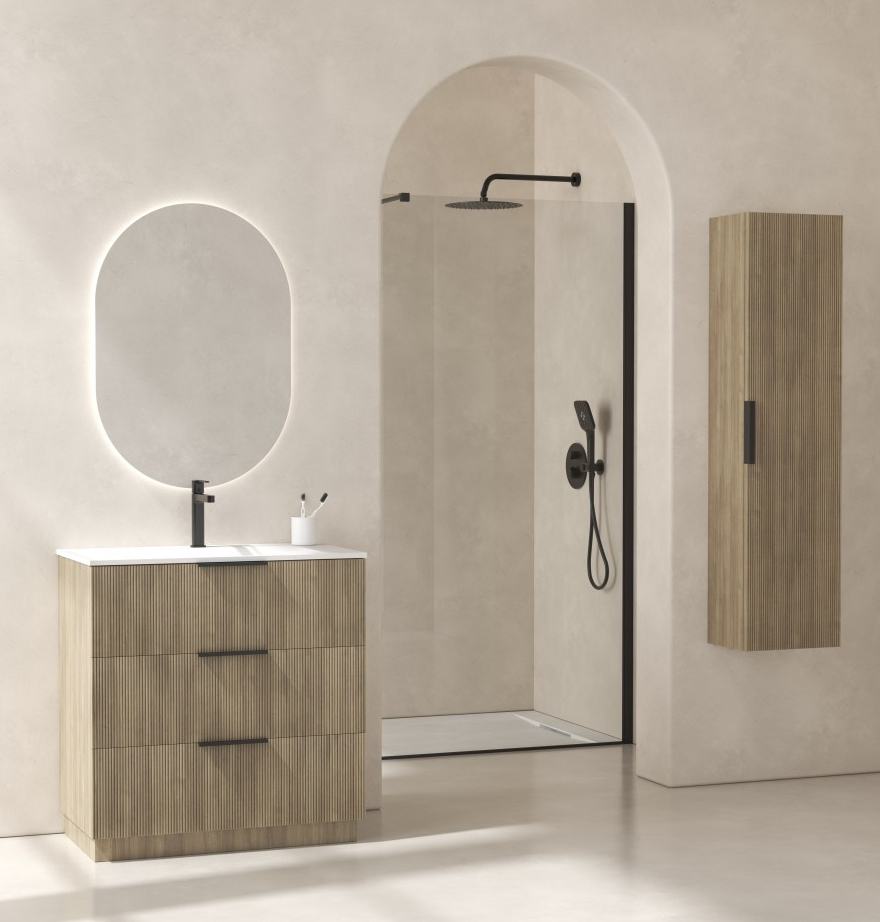 Une collection élégante et raffinée déclinée dans des tons doux et lumineux, laquée blanc, sable ou aloé et en finition polylaminée chêne Nairobi.